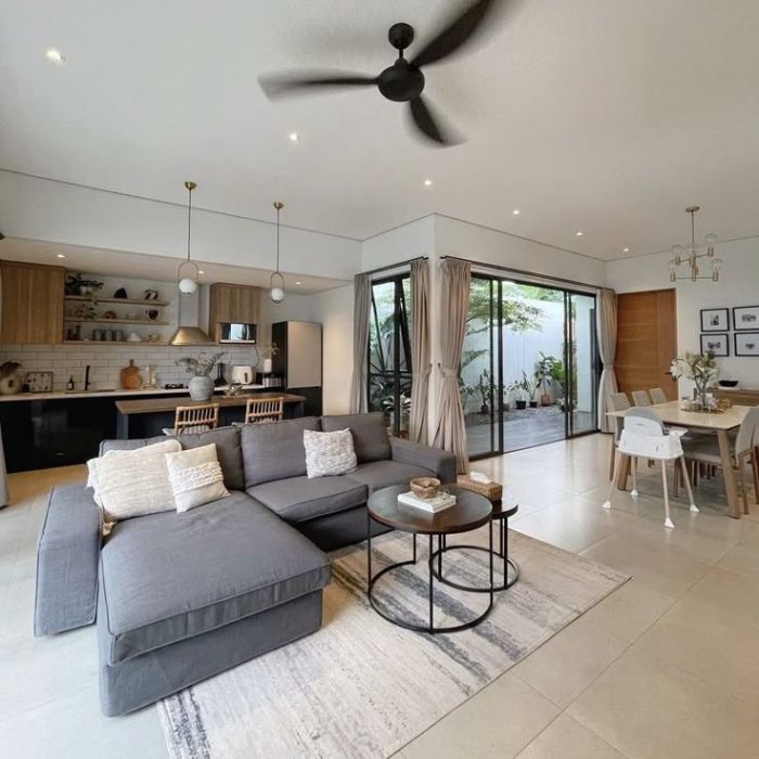 Gaya minimalis fokus pada kesederhanaan dengan furnitur secukupnya dan penataan yang rapi. Ciri khasnya adalah penggunaan warna netral, pencahayaan maksimal, dan ruang yang terasa lapang. Konsep ini cocok untuk hunian dengan ukuran terbatas atau bagi mereka yang menginginkan tampilan bersih dan modern.