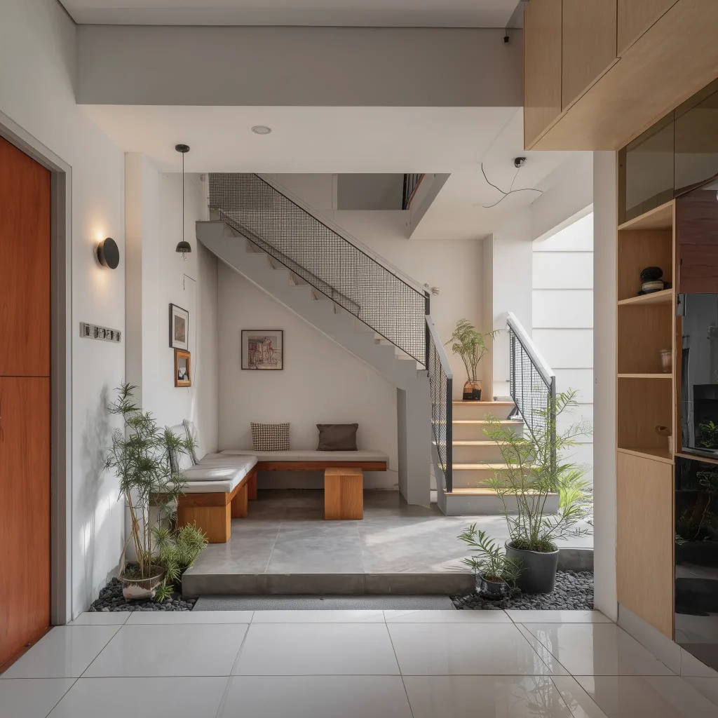 Material lantai area bawah tangga harus menerus dari lantai utama untuk menjaga kontinuitas visual.