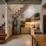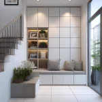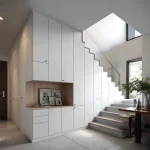 Kabinet bawah tangga dirancang menggunakan sistem pintu push-to-open tanpa tarikan (handleless). Jika digunakan sebagai area pajang, rak dibuat terbuka dengan modul kotak yang presisi.