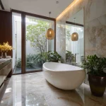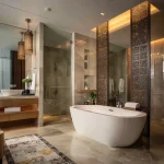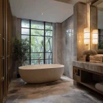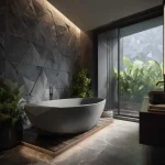 Dinding menggunakan granit motif batu alam dengan tekstur kasar atau panel kayu anti-air (WPC). Area di belakang bathtub diberi tekstur fluted atau batu sikat.