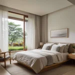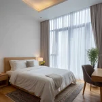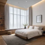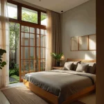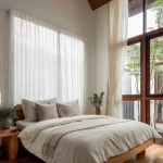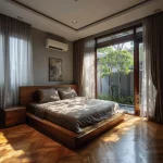 Cahaya yang disaring oleh gorden sheer akan memantul lembut pada permukaan lantai kayu, menciptakan suasana yang intim.