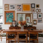 Hiasi dinding dengan potongan cermin berbentuk geometris yang tidak beraturan dengan bingkai logam ramping untuk menambah kesan mewah.