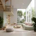 Dinding didominasi plesteran halus dengan finish cat putih bersih atau abu-abu muda. Sesekali digunakan aksen kayu terang atau warna pastel.
