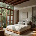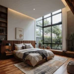 Seimbangkan cahaya atas yang dingin dengan material lantai dan furnitur kayu yang memberikan kehangatan khas Japandi.