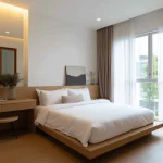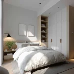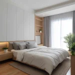 Pilih tempat tidur dan nakas dengan sudut tumpul yang ramah anak. Untuk lemarinya, pakai pintu geser minimalis yang menyatu dengan dinding supaya ruangan tidak kelihatan penuh.