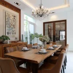 Gunakan lampu gantung (chandelier) tepat di tengah meja sebagai sumber cahaya utama yang hangat. Tambahkan dekorasi meja berupa vas bunga simetris.