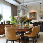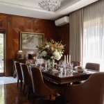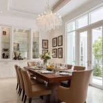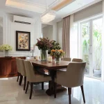 Dinding di sekitar meja makan sering diberi cermin besar atau panel dekoratif untuk menciptakan ilusi ruangan yang lebih luas saat tamu berkumpul banyak.