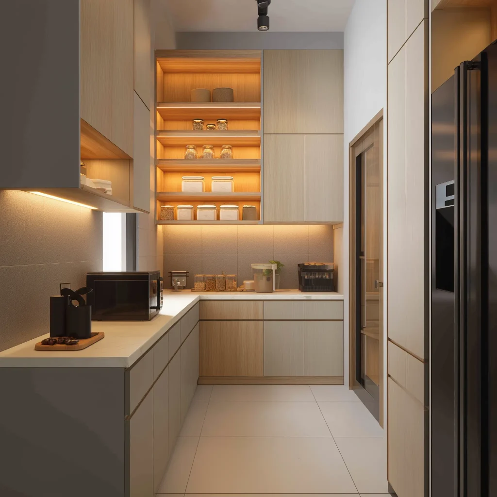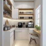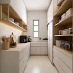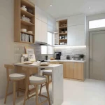 Cooker hood slim atau built-in tersembunyi. Sink minimalis (undermount). Rak piring atau organizer vertikal di dalam kabinet.