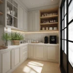 Kabinet atas dan bawah menggunakan plywood atau MDF dengan finishing HPL putih matte atau veneer kayu terang (light oak). Desain handleless menggunakan push-open atau j-pull handle.