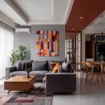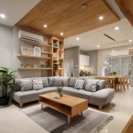 Menggunakan granit besar atau vinyl motif kayu dengan susunan linear yang konsisten. Penempatan karpet area dengan pola geometris sederhana membantu memberikan zonasi dan rasa hangat pada area duduk.