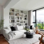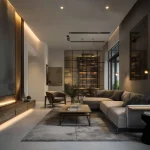 Dinding menggunakan warna putih tulang atau abu-abu muda. Panel TV dirancang minimalis tanpa banyak ornamen, seringkali menyatu dengan sistem penyimpanan hidden storage.