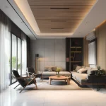 Sofa modular dengan garis tegas yang dibalut kain fabric berkualitas. Meja kopi menggunakan kombinasi material metal dan kayu dengan bentuk geometris murni.