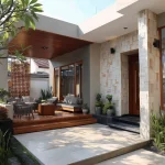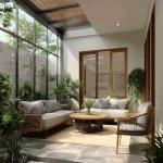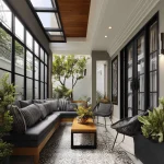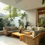 Pilih kursi dengan rangka ramping (aluminium atau rotan sintetis premium) yang dipadukan dengan bantalan berbahan kain khusus luar ruangan.