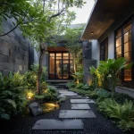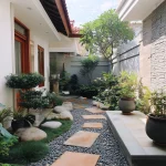 Gunakan kombinasi batu alam untuk jalur setapak agar kaki tetap bersih sekaligus membantu resapan air hujan langsung ke tanah.
