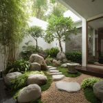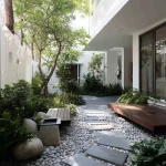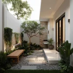 Tempatkan satu titik fokus berupa bangku kecil atau area duduk minimalis di ujung jalur sebagai tempat untuk berdiam diri.